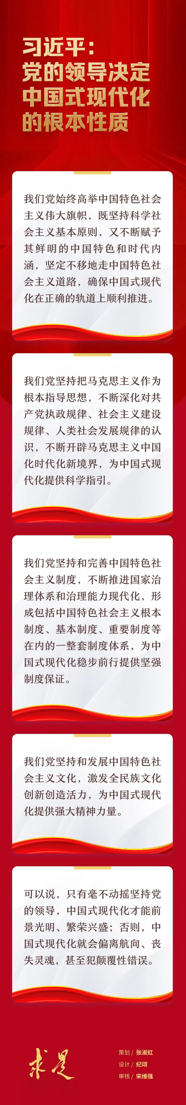在2023年第11期《求是》雜志刊發的習近平總書記重要文章《中國式現代化是中國共產黨領導的社會主義現代化》中,總書記從中國特色社會主義道路、理論、制度、文化4個方面,深刻闡明“黨的領導決定中國式現代化的根本性質”。