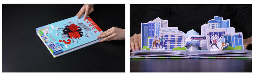 選擇以災(zāi)害風(fēng)險(xiǎn)中與百姓最為貼近的地震災(zāi)害作為切入口,通過(guò)采用近些年成為科普新風(fēng)尚的“互動(dòng)立體書(shū)”的方式,擇取學(xué)校、社區(qū)、醫(yī)院等常見(jiàn)人員密集場(chǎng)所進(jìn)行場(chǎng)景機(jī)關(guān)設(shè)計(jì),對(duì)地震知識(shí)、地震避險(xiǎn)知識(shí)、地震標(biāo)準(zhǔn)等相關(guān)內(nèi)容進(jìn)行拆解重組展示介紹。“動(dòng)手閱讀”的立體書(shū),將枯燥的科普知識(shí)轉(zhuǎn)變?yōu)橐龑?dǎo)式探索,賦予了閱讀趣味性,有效觸發(fā)目標(biāo)受眾好奇心與閱讀探索欲。