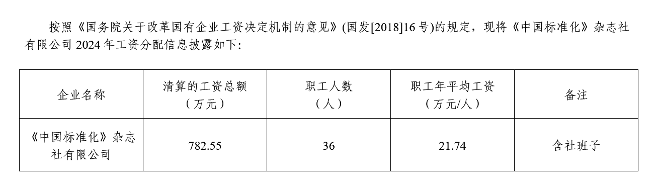 2024年《中國標準化》雜志社有限公司工資分配信息披露