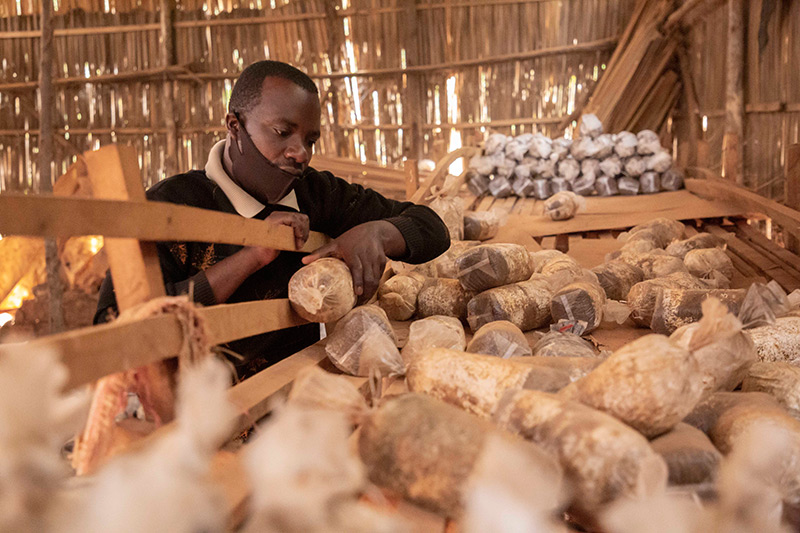 在盧旺達(dá)首都基加利的一家食用菌培育作坊,作坊主人埃馬紐埃爾·阿希馬納檢查菌袋(2020年9月9日攝)。中國(guó)福建農(nóng)林大學(xué)的菌草專家2006年來到盧旺達(dá)開始菌草技術(shù)合作項(xiàng)目,在當(dāng)?shù)厥痉逗屯茝V菌草技術(shù)。新華社發(fā)(西里爾·恩德格亞 攝)
