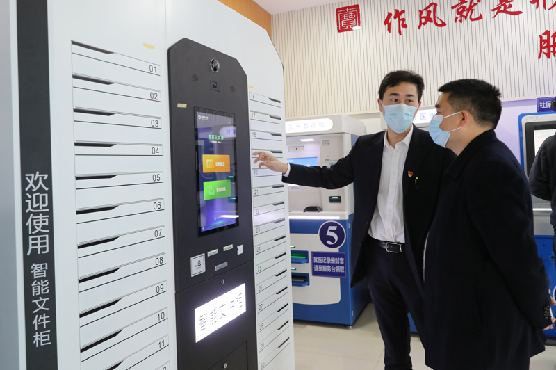 上海市閔行區七寶鎮社區事務受理服務中心的工作人員(左)向前來辦事的居民介紹智能文件柜的使用方法(2021年3月3日攝)。新華社記者 方喆 攝