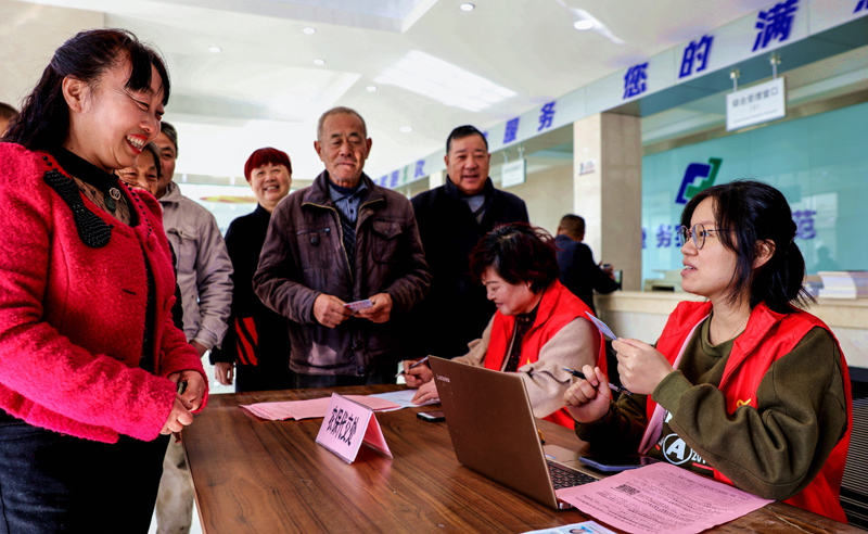 河北省邢臺市襄都區宴家屯鎮綜合服務中心工作人員協助辦事群眾填寫相關表格(2022年3月30日攝)。新華社發(張馳 攝)