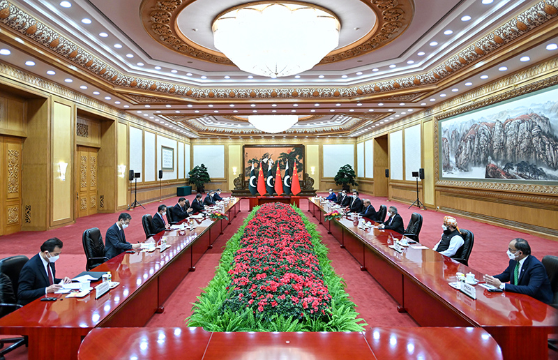 11月2日上午,國家主席習近平在北京人民大會堂會見來華進行正式訪問的巴基斯坦總理夏巴茲。新華社記者 謝環馳 攝