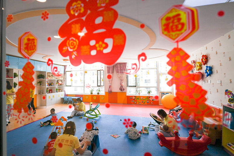 在呼和浩特市兒童福利院,教職工在陪伴兒童們玩耍(2019年5月28日攝)。新華社記者 王靖 攝
