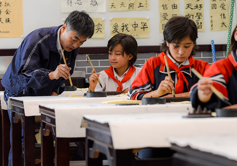 在新疆疏附縣托克扎克鎮(zhèn)中心小學(xué)書法教室內(nèi),王莊鐵老師在教學(xué)生寫毛筆字(2017年9月26日攝)。新華社記者 趙戈 攝