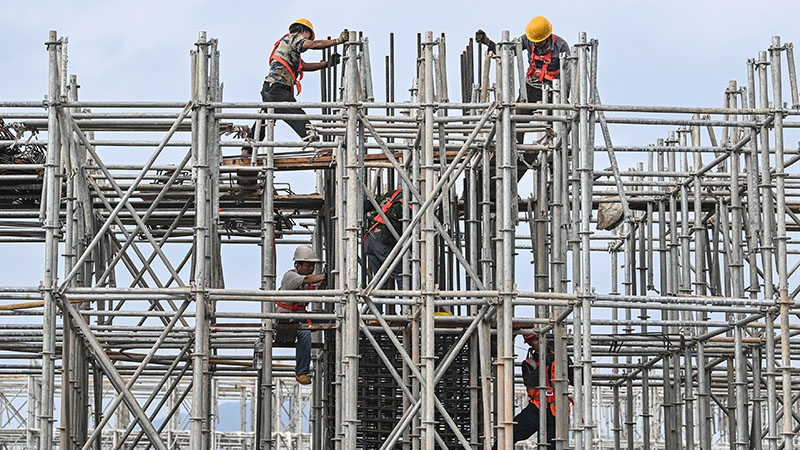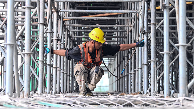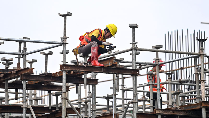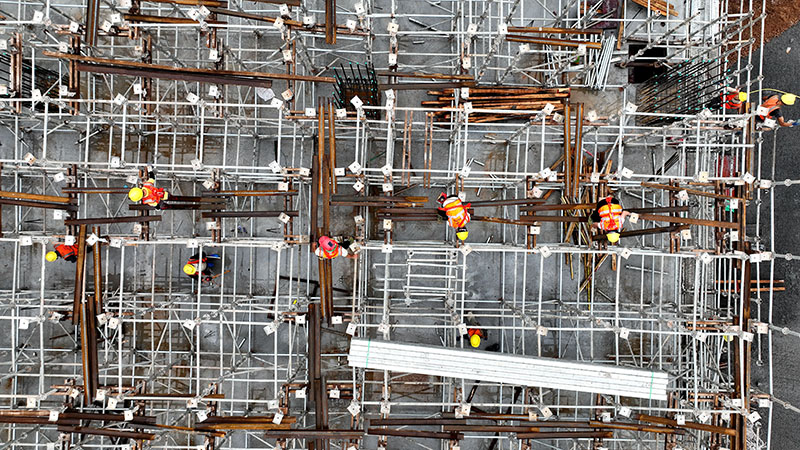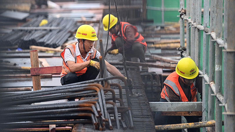 在玉林北站工地,工人在鋪設(shè)樓面鋼筋(11月27日攝)。